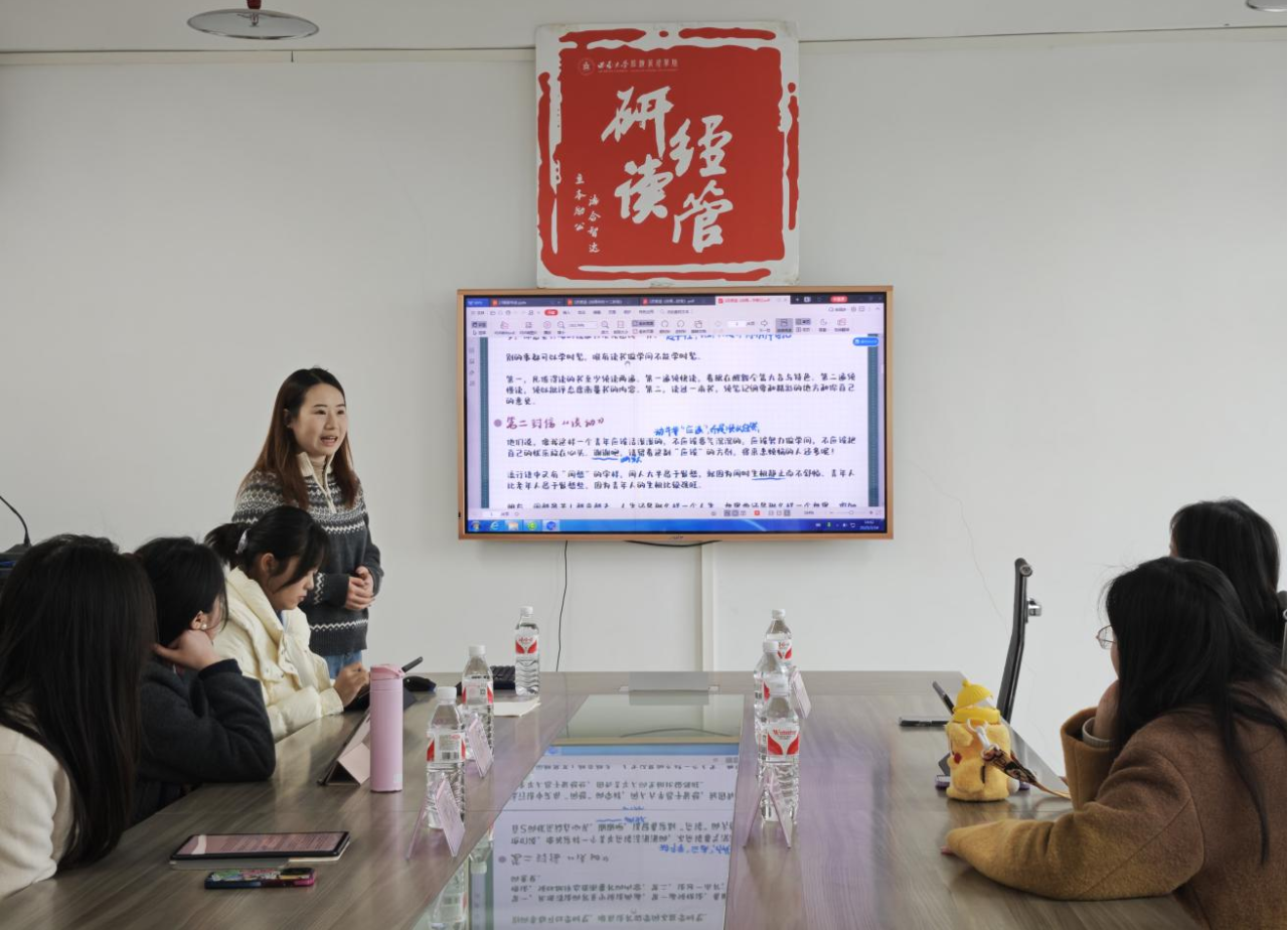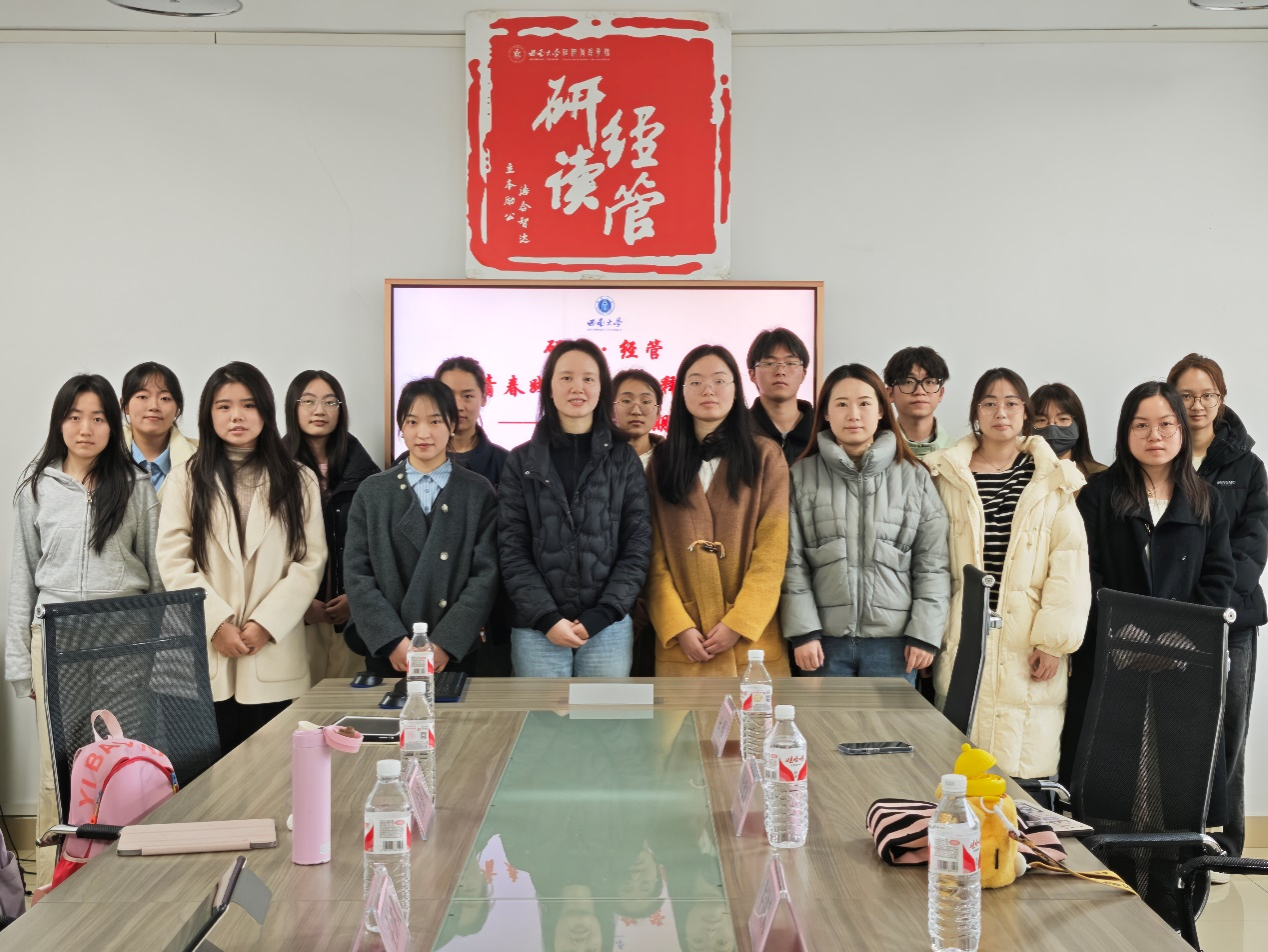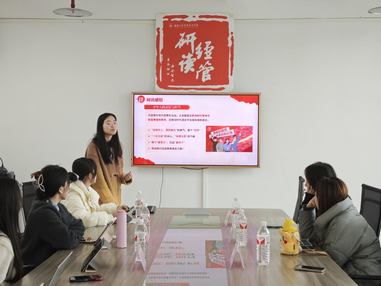 2025年3月14日下午,304永利集团“研读·经管”读书会第二十七期在304永利集团A406教室顺利举行。本次读书会以“青春践使命 奋斗释担当”为主题。由公司2023级农业管理专业硕士研究生苏紫涵、区域经济学专业硕士研究生吴双虹和2024级企业管理专业硕士研究生曾璐瑶、农村发展专业硕士研究生陆逸担任主讲人,研究生辅导员任娟出席活动并作总结。本次读书会由2024级金融专业硕士研究生刘楠主持。