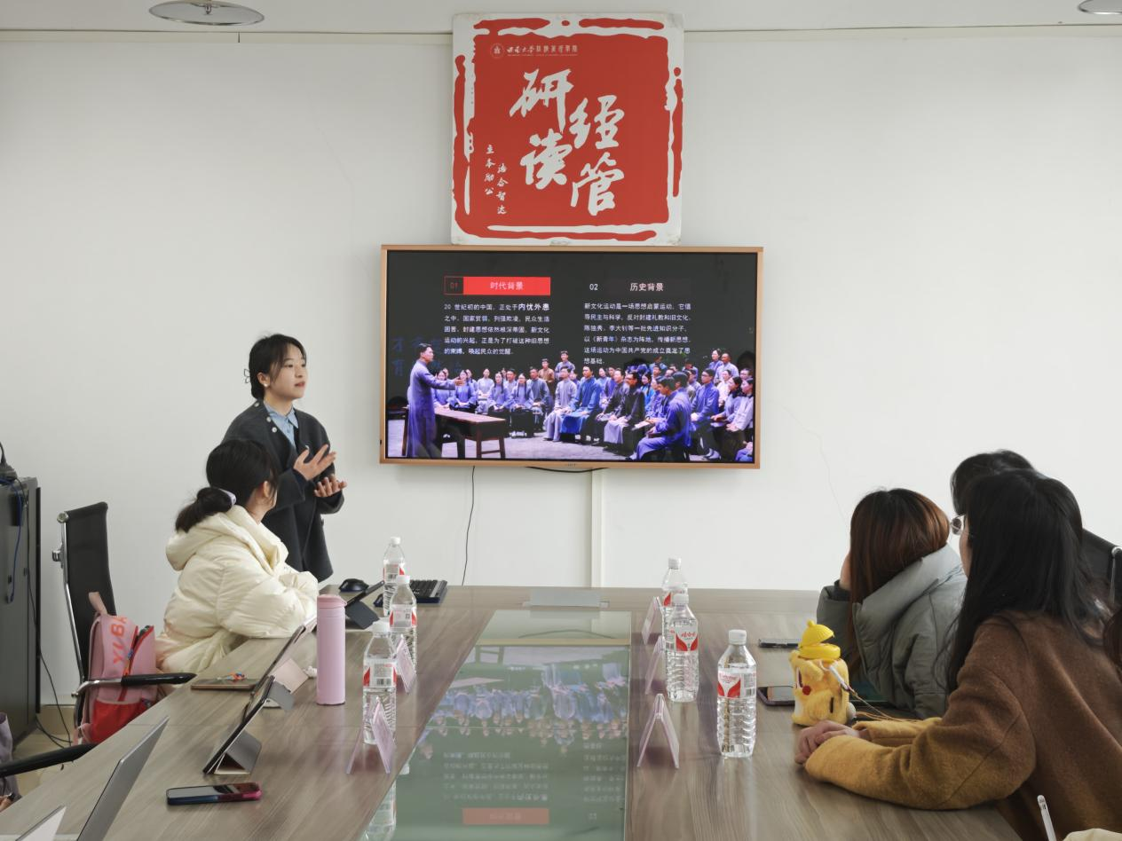 陆逸同学分享了《觉醒年代》一书。她通过解读书中主要人物陈独秀、李大钊、胡适等人的英勇事迹和性格特点,带大家回忆了新文化运动、五四运动及中共成立时的壮丽历史。陆逸同学从中提炼出“青年觉醒”的核心主题,强调作为新时代青年应当从先辈的奋斗征程中汲取力量,赓续觉醒精神,勇担时代赋予的使命,为建设美好家国、推动社会进步奋勇前行。