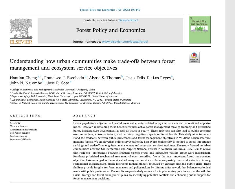 Cheng, H., Escobedo, F. J., Thomas, A. S., De Los Reyes, J. F., Ng’ombe, J. N., & Soto, J. R. (2025). Understanding how urban communities make trade-offs between forest management and ecosystem service objectives. Forest Policy and Economics, 172, 103445.