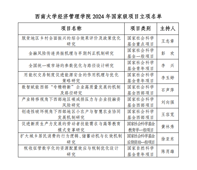 国家自然科学基金委员会和全国哲学社会科学办公室相继公布2024年国家自然科学基金年度项目、全国教育科学规划项目、国家社会科学基金年度项目和国家社会科学基金后期资助项目立项名单。公司再添国家社会科学基金年度项目8项、后期资助项目1项及国家自然科学基金项目1项,涉及经济学、管理学和社会学等各学科。
