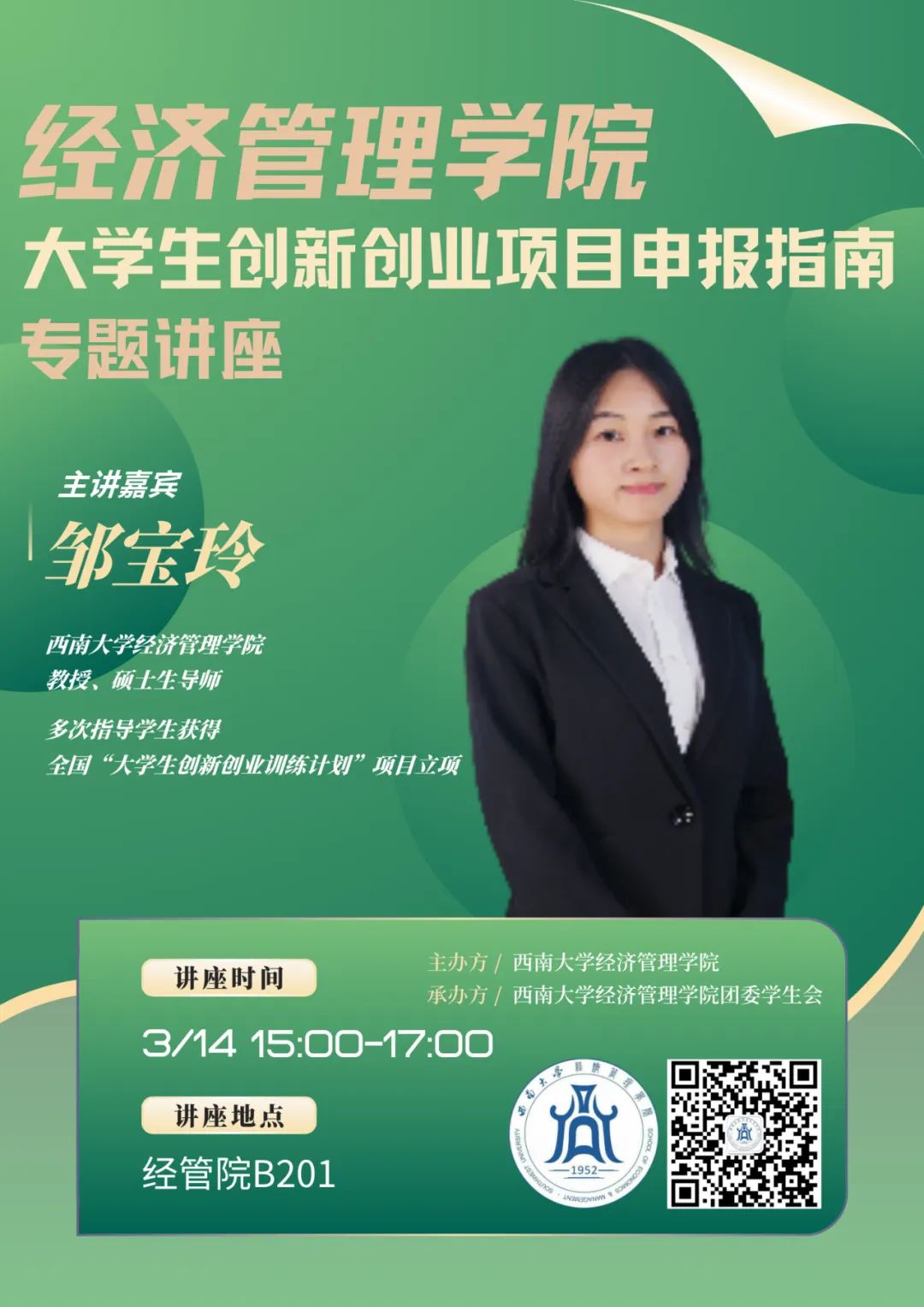 活动简介:近日,2025年度“老员工创新创业训练计划项目”的申报正在如火如荼地进行。同学们在撰写申报书过程之中,难免会遇到一些困难和疑惑。今天,我们请来了具有丰富大创立项经验的名师——邹宝玲教授为大家解疑答惑。诚邀各位同学前往经管院B201聆听!
