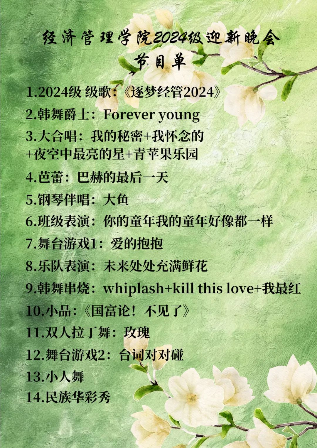 活动简介:春风送暖,万象更新。新的一年,经管院又迎来了一批新的朝气。在这充满希望的季节里,我们即将迎来2024级304永利集团迎新晚会,我们期待与你一起共赏这场青春与梦想交织的视听盛宴、共赴这场青春之约。(附节目单)