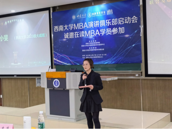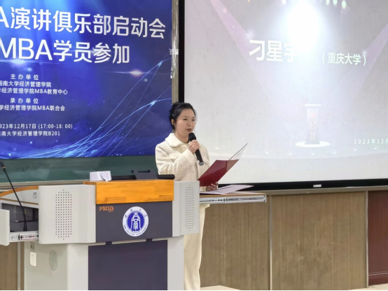 俱乐部联合发起人、2023级大成班夏小斐同学表示,俱乐部的创立得到了公司领导的高度认可与支持,同时也离不开金绍荣主任、颜莉娟老师、白秋梅老师和李若男老师的悉心指导,更离不开创始人谭和琼学姐的辛勤付出。她强调,俱乐部的成立旨在汇聚更多志同道合的朋友,共同绽放出属于MBA人的智慧和魅力。她希望演讲俱乐部能成为一个对同学们具有真正价值、能够互相成就的交流平台。她鼓励大家“不忘初心,不负韶华,追求卓越的同时,不忘做一个温暖的人。”