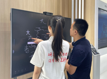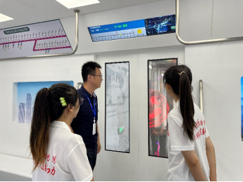 在重庆京东方工作人员孔令鹏的带领下,队员们参观了京东方技术创新中心展厅。展厅内,工作人员和队员们亲切互动,通过现场解说、实景呈现和视频播放等多种形式,介绍了京东方在传感器、显示器及智慧系统创新应用方面的最新成果,深入讲解了企业在智慧园区、智慧校园、家庭场景、数字展陈场景等产品领域的布局及经典案例,带领队员们体验了京东方半智慧黑板、智能交互画屏等创新产品。听完讲解后,队员们了解到京东方的发展经历了“转型创业、发展主营”“突破‘屏’颈、迈向领先”“实现领先、智见未来”三个历史发展阶段,感受到了京东方在创业创新实践中形成的优秀企业文化和方法论体系。