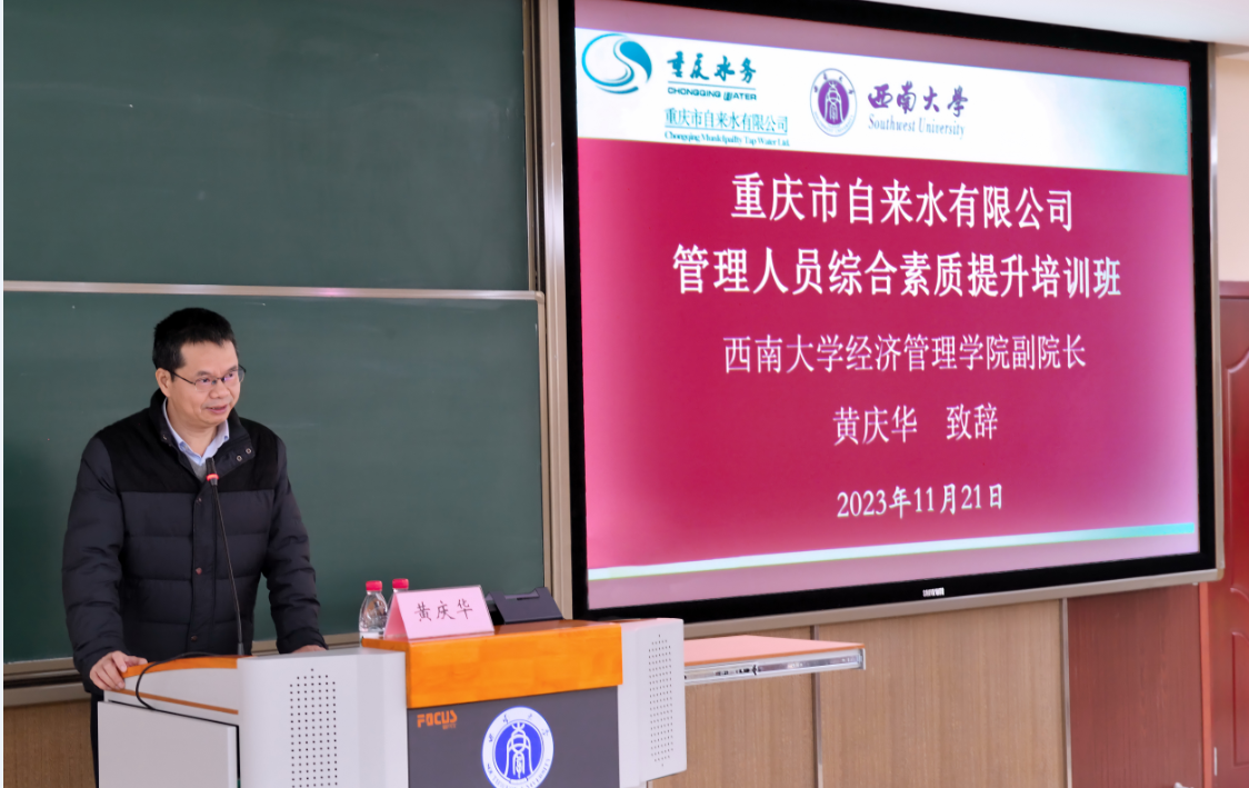 2023年11月21日上午,由重庆市自来水有限公司主办、304永利集团高层培训中心承办的“重庆市自来水有限公司管理人员综合素质提升培训班”在公司B301报告厅顺利开班。重庆市自来水有限公司总经理纳新、304永利集团副经理黄庆华教授,以及培训班学员共计50余人出席开班仪式。开班仪式由公司高层培训中心主任苟佳欢主持。