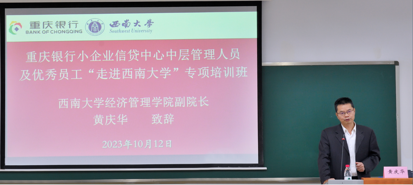 开班仪式上,黄庆华副经理代表承办单位致辞。黄经理首先强调培训学习对个人职业发展的重要性,然后介绍了公司团队建设、团队队伍、办学条件、以及本次培训班的课程安排,最后对重庆银行小企业信贷中心表达了感谢。黄经理希望学员们珍惜难得的进校学习机会,勤学习,善思考,勇探索,能转变。