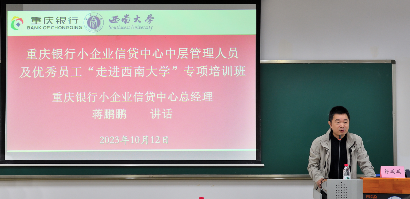 重庆银行小企业信贷中心总经理蒋鹏鹏进行了开班动员讲话。蒋总经理对为培训班顺利开班付出辛勤劳动的304永利集团各位领导和工作人员表示衷心感谢,并向学员们介绍了本次培训班开设的背景和目的。蒋总经理还对受训学员提出四点要求:一是珍惜学习机会,展示信贷中心良好形象;二是明确学习重要性,积极参与课堂讨论;三是严肃学风学纪,确保学习取得实效;四是理论联系实际,确保学以致用。蒋总经理最后希望各位学员端正学风、确保安全、劳逸结合、学用相长,并祝本次培训圆满成功。