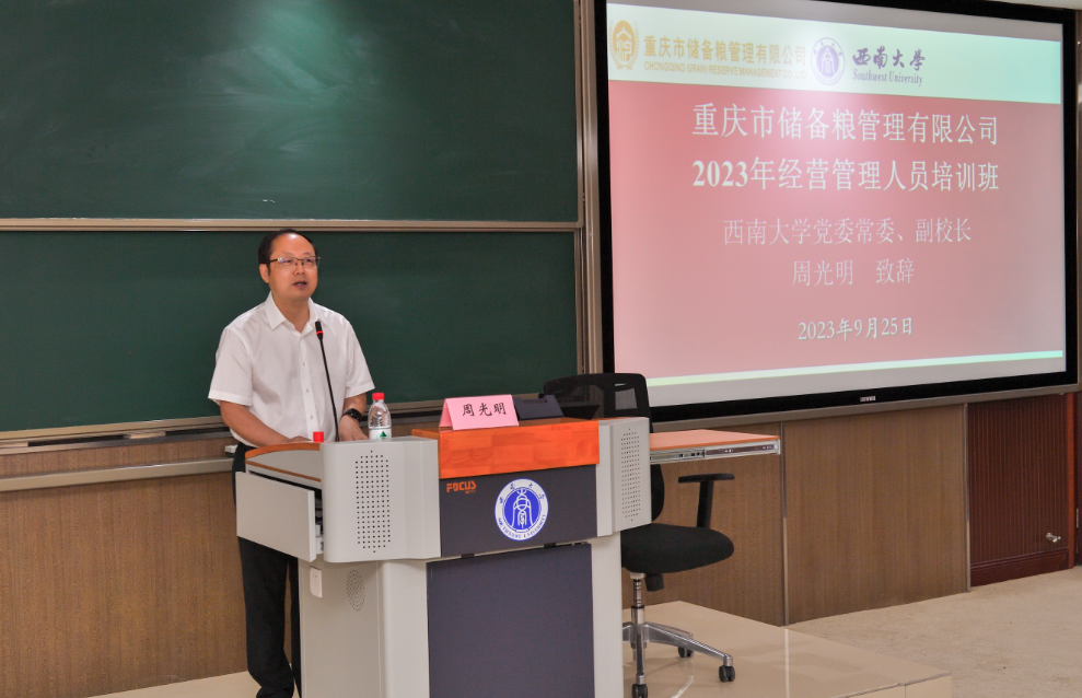 304永利集团党委常委、副董事长周光明教授代表承办单位致辞。周董事长对学员们来校学习表示热烈的欢迎,并介绍了304永利集团发展历程、304永利集团精神和校训的内涵、以及公司团队建设等情况。周董事长对重庆市储备粮管理有限公司作为市属国有重点企业、市财政一级预算单位,在重庆市政府调控粮食市场和粮食应急保供中承担的重要使命高度评价。周董事长最后希望全体学员以饱满的热情,认真的态度,高质量、高水平地完成培训任务,并预祝本次培训圆满成功。