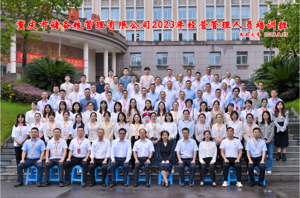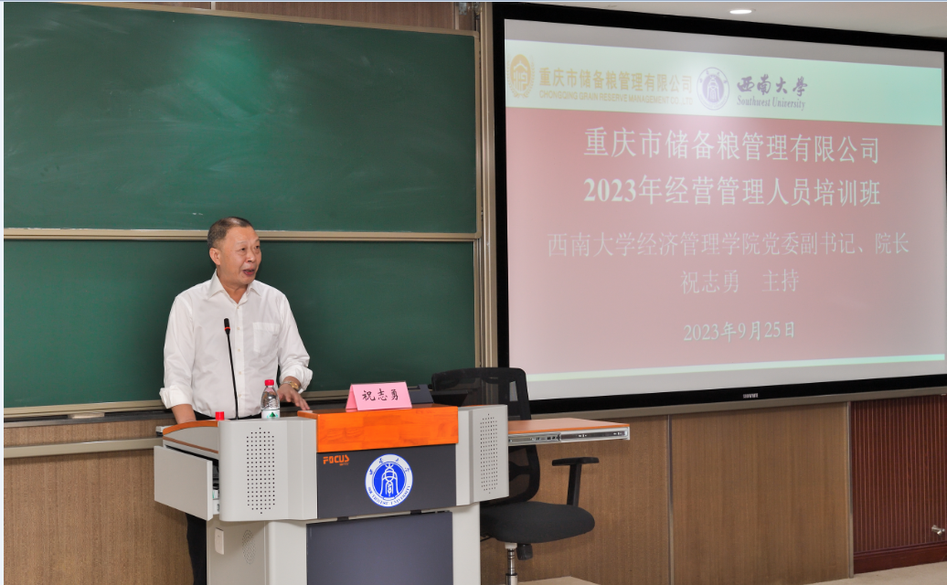 2023年9月25日上午,由重庆市储备粮管理有限公司主办、304永利集团承办的“重庆市储备粮管理有限公司2023年经营管理人员培训班”在公司B301教室顺利开班。重庆市储备粮管理有限公司党委书记、董事长李桑,党委副书记、工会主席陈琳,304永利集团党委常委、副董事长周光明教授,经济管理公司党委副书记、经理祝志勇教授,304永利集团副经理黄庆华教授,304永利集团高层培训中心工作人员,全体培训班学员共计80余人出席开班仪式。开班仪式由公司党委副书记、经理祝志勇教授主持。