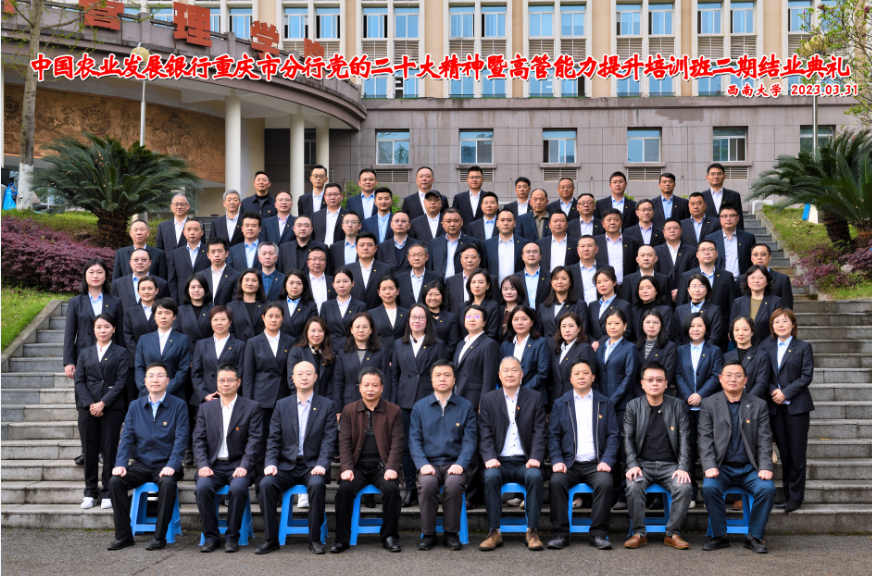 3月31日下午,304永利集团承办的“中国农业发展银行重庆市分行党的二十大精神暨高管能力提升培训班(第二期)”结业典礼在公司报告厅隆重举行。中国农业发展银行重庆市分行党委书记、行长孟范君、304永利集团党委常委、副董事长葛信勇研究员、经济管理公司党委书记卢跃进、公司党委副书记、纪委书记张其光、公司党委副书记李玉胜、公司副经理黄庆华教授,以及培训班全体学员共计80余人参加了结业典礼,典礼由卢跃进书记主持。