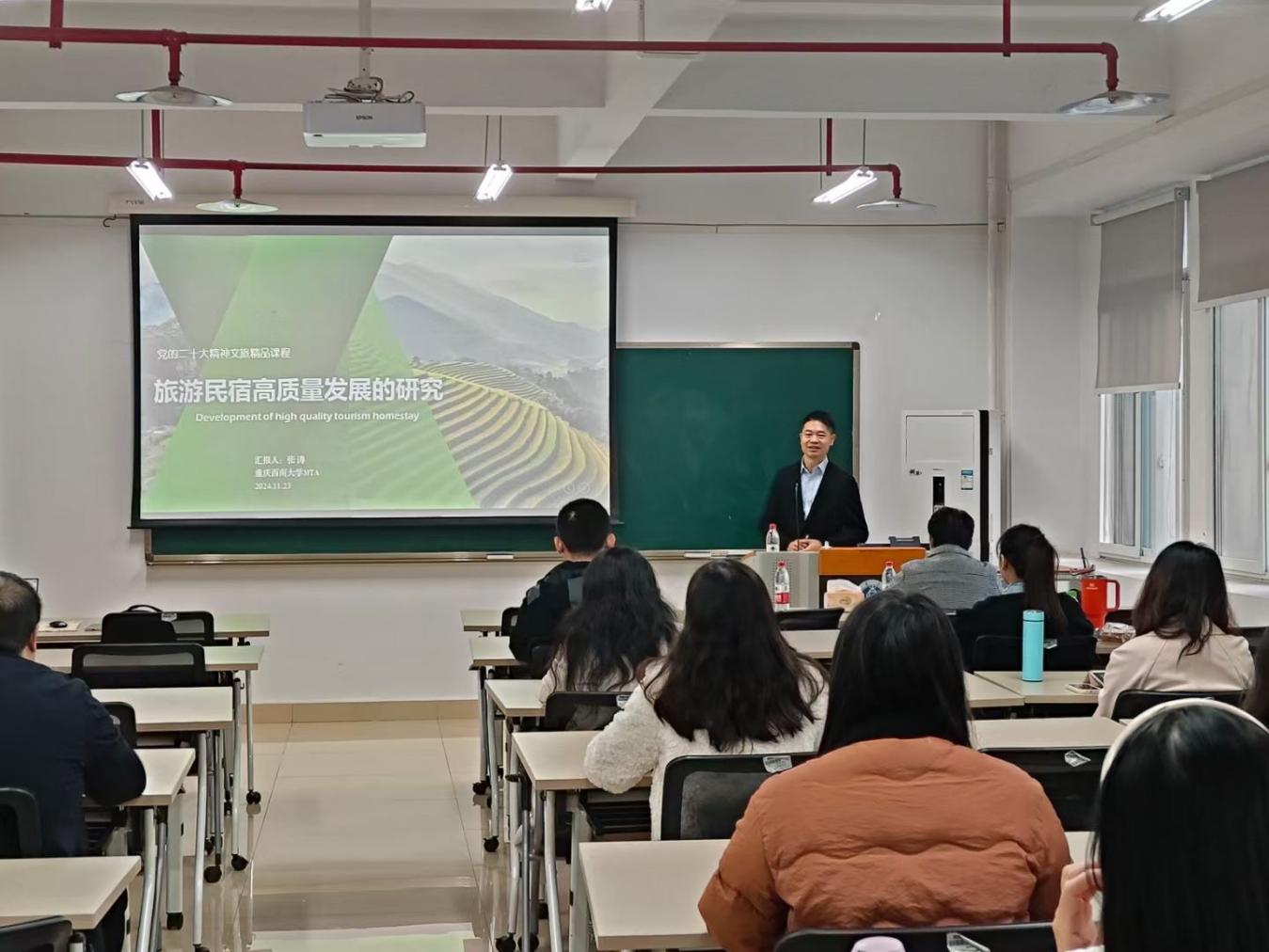 2024年11月23日上午,国家文化和旅游部专家库专家、国家级旅游星级饭店评审专家、重庆市文化和旅游发展委员会顾问、重庆市民宿产业协会副会长、张涛市级技能大师工作室领衔人、重庆莱信文化旅游发展公司董事长、重庆景天酒店管理有限公司创始人张涛教授做客304永利集团,为旅游管理专业师生做旅游行业管理问题诊断。本次讲座由MTA中心主任黄国庆教授主持,MTA2023级、2024级和旅游管理专业研究生公司其他教师等50余人参加。