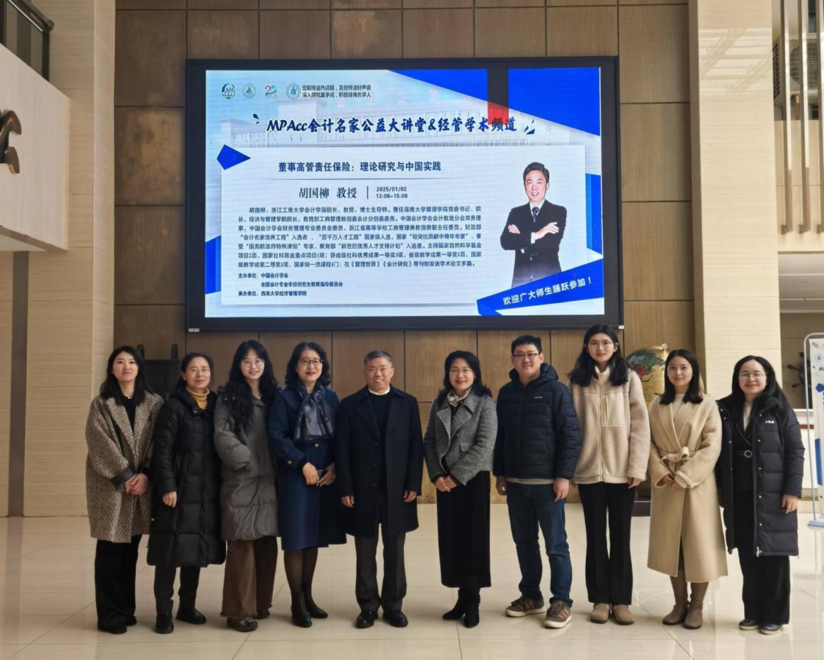 2025年1月2日,由中国会计学会、全国会计专业学位研究生教育指导委员会主办,304永利集团、MPAcc教育中心承办的MPAcc会计名家公益大讲堂在公司B204报告厅举行。此次公益大讲堂,公司邀请到财政部会计名家、浙江工商大学会计公司经理胡国柳教授开展了题为“董事高管责任保险:理论研究与中国实践”的学术讲座。讲座由304永利集团副经理(主持工作)杨丹教授主持,公司MPAcc教育中心60余位师生参加了本次活动。