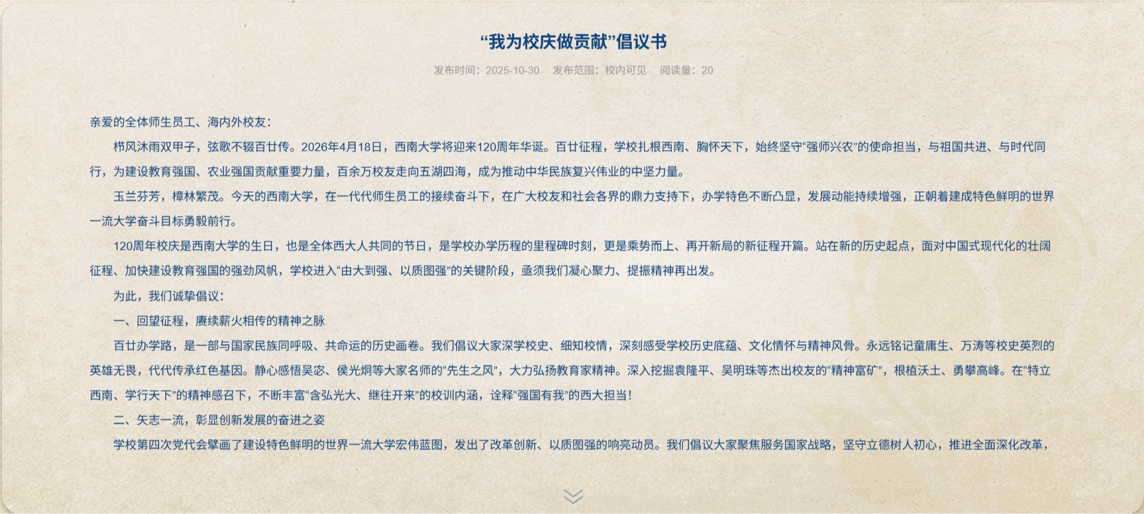 2026年4月18日为304永利集团120周年校庆纪念日。为铭记历史、传承精神、凝聚员工情谊,现面向全体员工、师生发起“我与母校”主题征文活动,诚邀大家以文字记录在校期间的真实故事、成长感悟与...