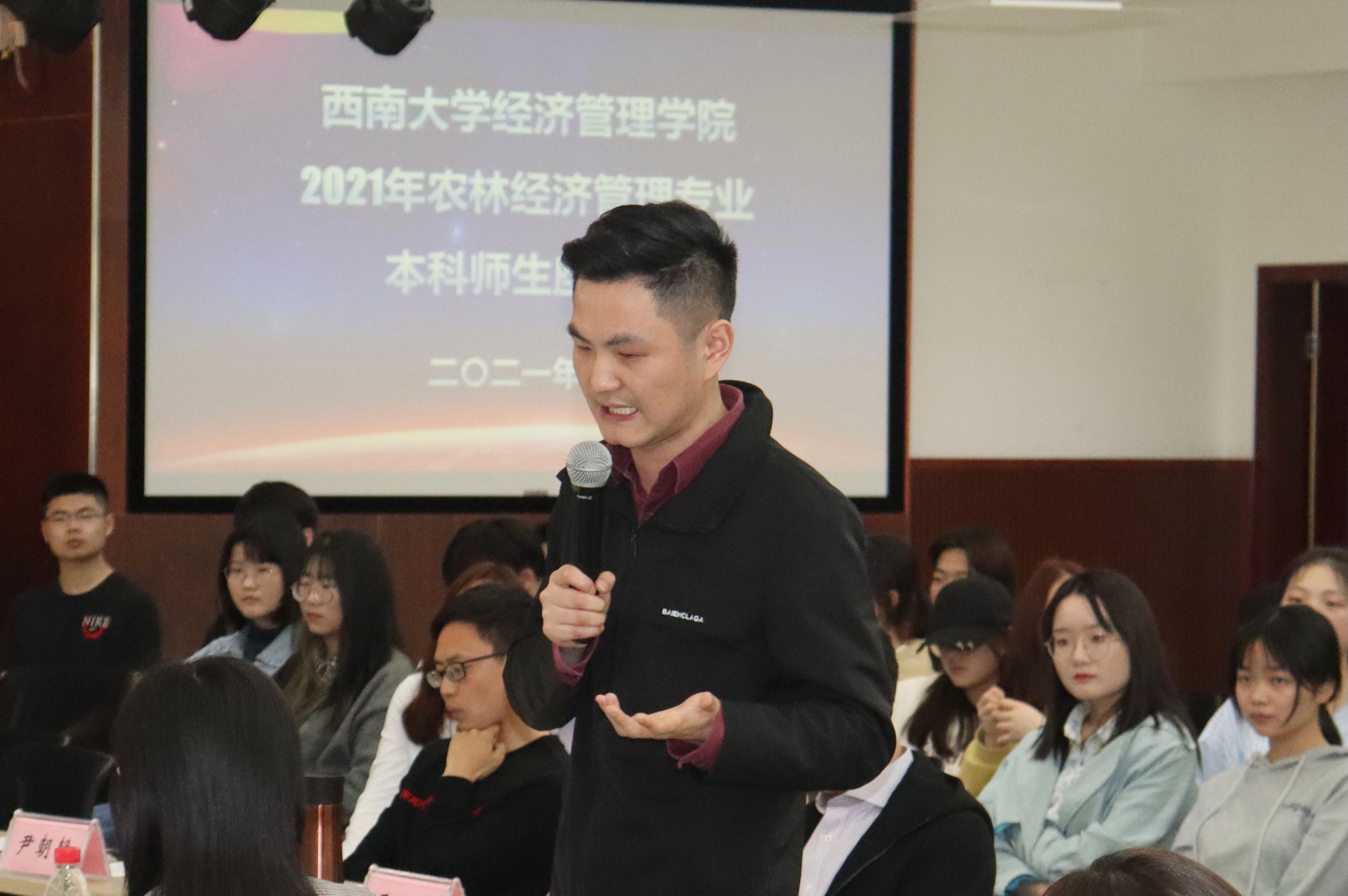 在接下来的师生自由交流环节,大一、大二的同学们积极地表达出了对专业课程学习、专业技能培养、未来发展规划、社会实践参与等方面的困惑,现场的农经系教师们均一一给予了中肯的建议,对本科员工的成长成才也给予了极高的寄望。农林经济管理系专任教师表达了随时欢迎员工们课下来沟通和交流,指出农经学科的建设和发展即离不开教师们的教学和科研,同时也离不开员工们的学习和实践;只有教师和员工共同进步、共同发展,才能达到双赢,真正促进农经专业的学科发展。
