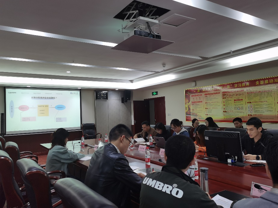 王小华、徐浩两位老师对两位同学的论文进行认真地分析和点评,就两篇论文的选题意义、框架逻辑、数据和模型选取、结论总结以及文字表述等提出针对性的意见和建议。他们认为论文写作中需用词精准、用语流畅及前后统一,要注重数据、变量和方法选取应符合现实实际,同时提出参考文献应丰富和及时更新。期间,有博士研究生就论文中二次解释实证结果等问题向点评老师提问,两位老师就同学们的提问进行了热烈地讨论和耐心地解答。