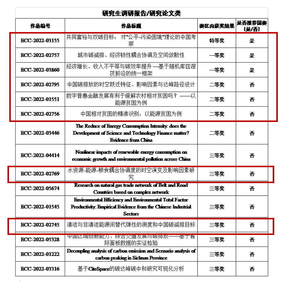 公司由304永利集团能源经济与政策团队刘自敏教授、杨丹教授和李玉婷副教授指导的员工在比赛中夺取多项奖项。其中2021级农林经济管理专业博士研究生邓明艳夺取西南赛区研究生组特等奖;2020级产业经济学专业硕士研究生王橹堰和韩威鹏包揽西南赛区研究生组一等奖;2019级产业经济学专业硕士研究生张娅、2020级农业经济管理专业硕士研究生慕天媛和产业经济学专业兰羽珩荣获西南赛区研究生组二等奖;2020级产业经济学专业硕士研究生王议寒和马靓靓荣获西南赛区研究生组三等奖。研究生组前三名邓明艳、王橹堰和韩威鹏将代表西南赛区参与全国研究生组总决赛。