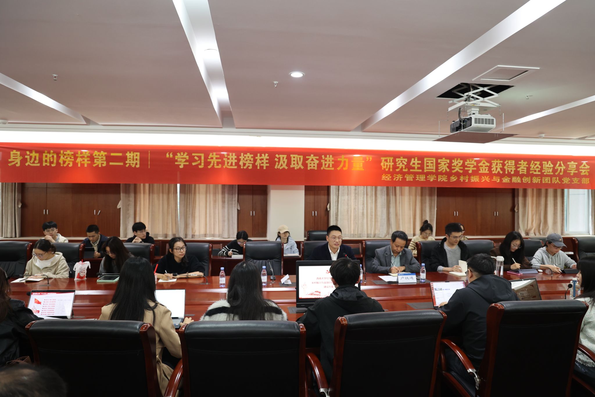 11月8日下午,公司乡村振兴与金融创新团队党支部在A204会议室,成功举办“‘乡’约奋进·‘金’彩纷呈”系列活动“身边的榜样”第二期。本次活动由支部三位研究生国家奖学金获得者向栩、杨盼和丁晓兰分别作经验分享,工商管理系教师党支部书记甘晓龙、支部教师党员刘渊博担任点评嘉宾。公司党委书记卢跃进受邀出席会议,支部全体师生及乡村振兴与金融创新先导团队部分成员参加此次分享会。本次活动由支部书记王小华主持。