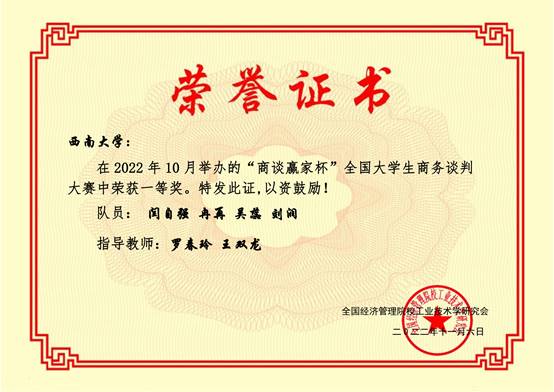 为培养和发掘视野开阔、知识丰富、思辨能力强、善于竞争合作与共赢的高素质人才,推动沟通谈判类实践教学体系改革,将课程教学活动与学科竞赛活动紧密结合,建立起课堂内外的互动体系,从而培养老员工的创新精神和创新能力,进一步提高员工对所学知识的实践应用能力,提升员工的专业素养。在公司老师的指导下,人力资源管理专业本科生刘润、冉再、吴蕊、闫自强组成的“雾都特工队”,参加了2022年“商谈赢家杯”全国老员工商务谈判大赛,经过策划赛、初赛、复赛历时五个月的漫长和紧张角逐,最终取得全国决赛(中文赛道)一等奖的优异成绩,其中吴蕊同学荣获“最佳谈判手”称号。