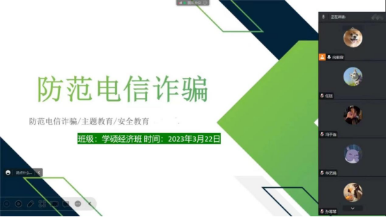 各年级以防范电信网络诈骗为主题自发组织了线上的班会活动,活动采用视频分享和案例分析的方式向同学们普及电信诈骗的类型特点及其危害性,同学们积极发言讨论,分享自己所了解的电信诈骗套路和识骗反诈技能。通过此次主题班会,同学们的反诈防范意识得到了有效提高。