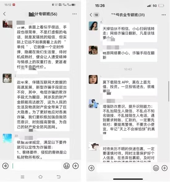 各班同学在班级群内对各类诈骗案例发表了自己的意见与感想。“莫下载陌生APP,莫在上面充值、投资”“擦亮眼睛明辨是非,惜命爱命绝不贪心”“不乱加陌生人微信、不乱点不知名链接、不乱接陌生人电话”“遇到要求转账、汇款的,一定要先核对,提高警惕,不要贪小便宜”“牢记天上不会掉馅饼的真理”“畅游网络要小心,诈骗手段在翻新”……同学们踊跃参与,从电信网络诈骗的惯用套路以及防范技能等方面展开讨论,进一步提高了对电信诈骗的警惕性与敏锐度。