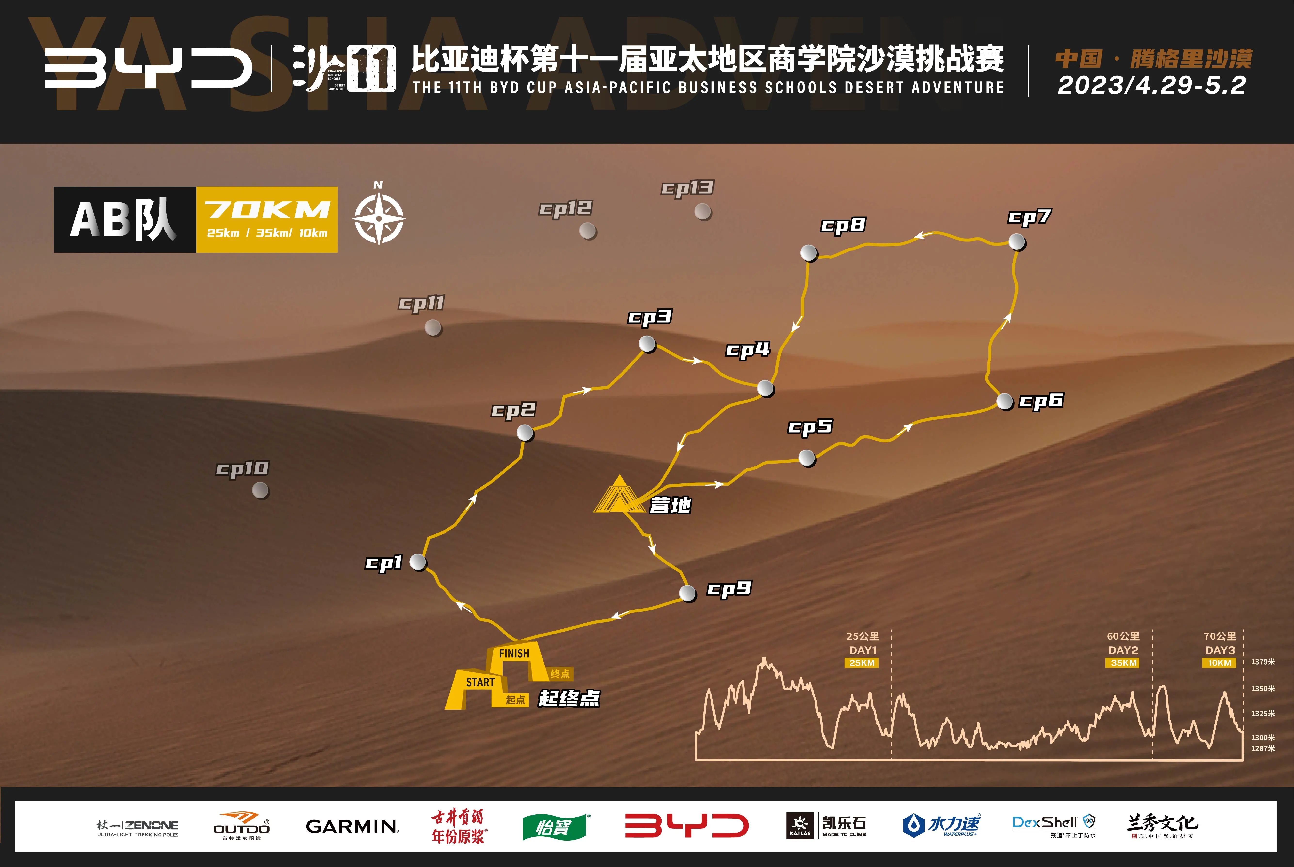 赛道描述:中小沙丘为主,地形较为平坦,爬升较小,可适当奔跑。储备体能,准备下一段的挑战。主要关注长时间跑步后的体能消耗,及时补充水分和能量。