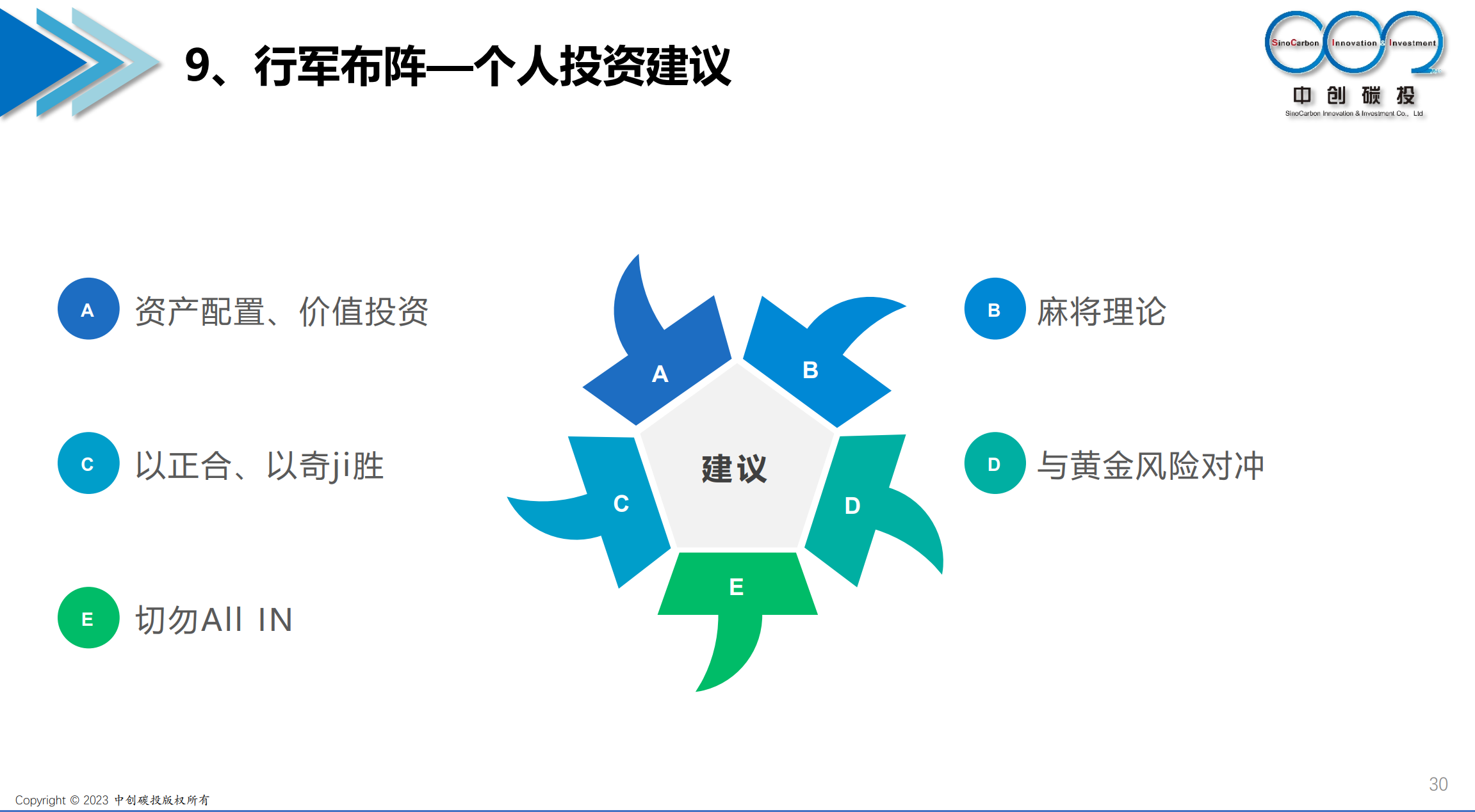 在个人投资方面,周老师提出了五条建议:第一、碳交易是区别于传统股票基金的,总体而言碳市场是帮助国家实现碳减排目标的一个政策市场。第二、麻将理论:正如打麻将不可能每一个人都赢钱,应该深入研究碳理论、碳政策,从而提高增加收益的可能性。第三、以正合、以奇胜,即应该做长线投资。第四、需要注意类似战争这类因素带来的黄金风险对冲。第五、不要有赌徒心态,不要ALL IN。