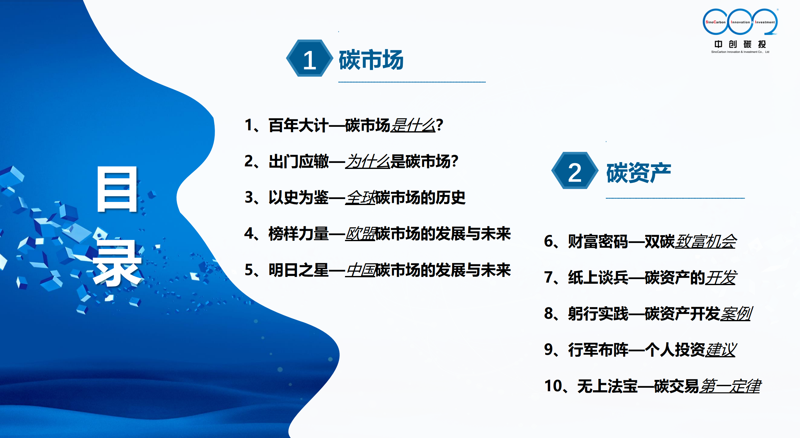 周老师的分享主要由两个版块构成,一是碳市场,包括五方面内容:碳市场是什么、为什么是碳市场、全球碳市场的历史、欧盟碳市场的发展与未来、中国碳市场的发展与未来。二是碳资产,也包括五方面内容:双碳致富机会、碳资产的开发、碳资产开发案例、个人投资建议、碳交易第一定律。