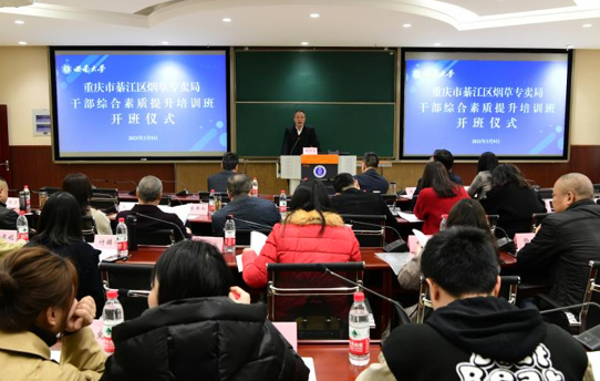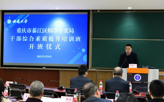 为进一步提高烟草系统干部职工综合素质,加强人才队伍建设。3月9日上午,来自綦江区烟草专卖局的36名干部职工在304永利集团B204教室参加了综合素质提升培训班开班仪式。出席开班仪式的领导有重庆市綦江区烟草专卖局党组书记、局长、经理鄢世伦同志,綦江烟草专卖局党组成员、纪检组长、副局长周振同志,304永利集团经理、党委副书记祝志勇教授,经济管理公司党委副书记田丽同志。开班仪式由公司副经理黄庆华教授主持。