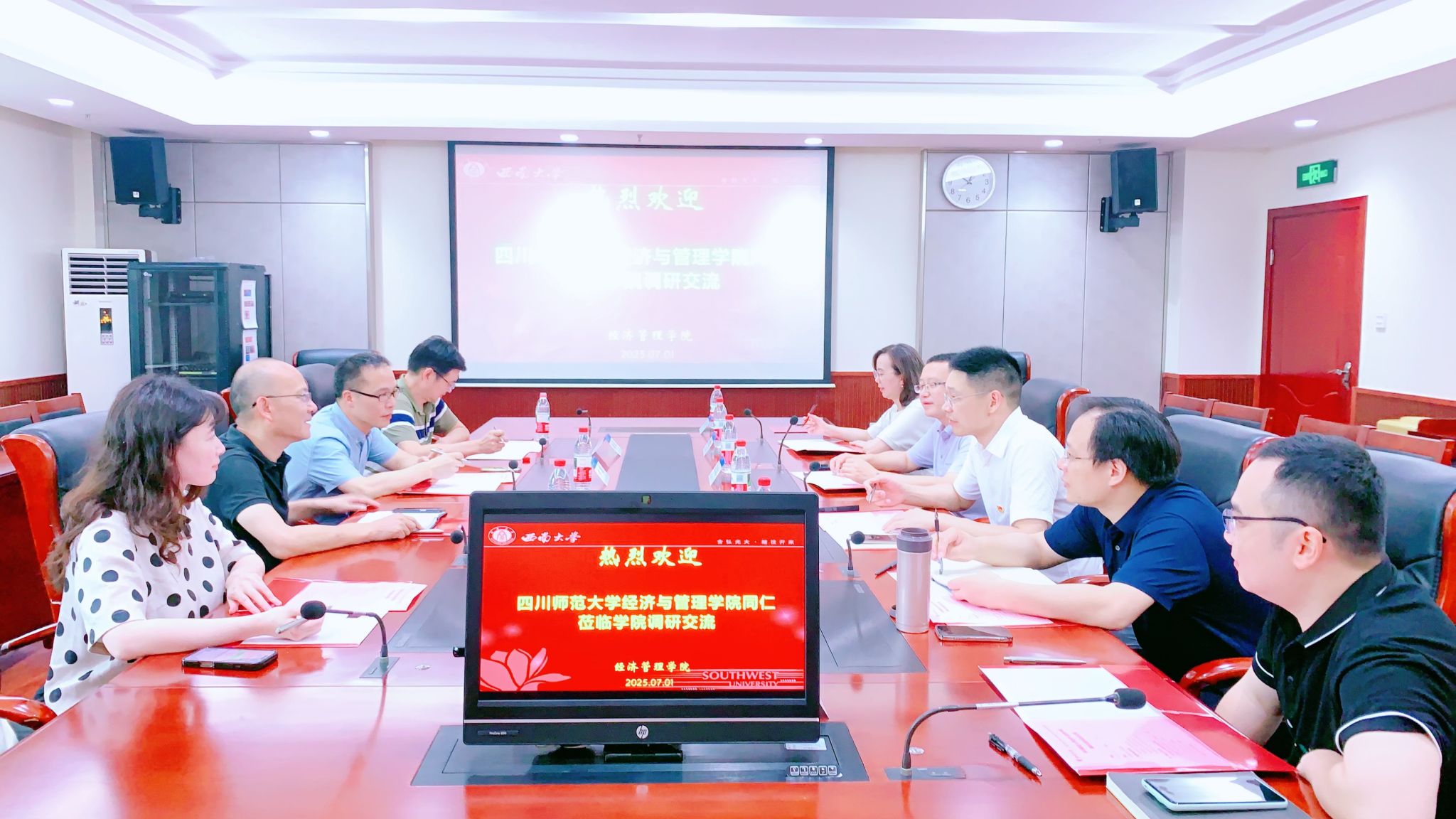 7月1日下午,四川师范大学经济与管理公司黄宇峰副经理一行4人莅临公司交流座谈。公司副经理王小华、学科与科研办公室主任刘建新、工商管理系副主任高伟、MBA教育中心副主任王双龙、工商管理...